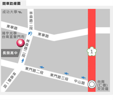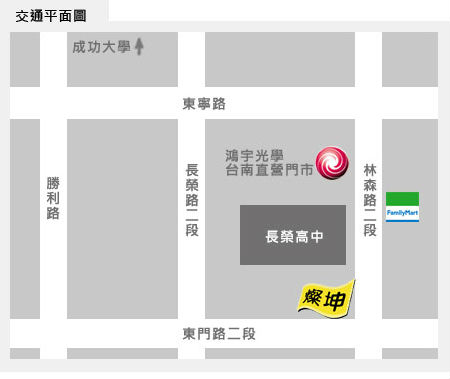 從台南(仁德)交流道下,往台南市區方向,走縣道182(中山路、東門路),於東門路二段右轉林森路二段,至林森路二段與東寧路交叉口等待左轉燈號迴轉,迴轉後前行100公尺,過了彩券行即可在右手邊看到鴻宇光學招牌。