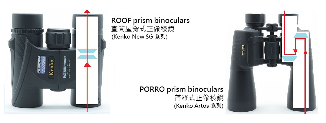 從雙筒望遠鏡外觀上,我們可以直接區分出Roof和 Porro 稜鏡系統,Porro 稜鏡系統的雙筒望遠鏡外觀看起來像是N字型或Ζ字形,使用2個直角稜鏡,利用內全反射原理將影像反轉。不論是哪一種,其目的就是將光線由原本的反像轉換成成為正立像。早期大多使用Porro稜鏡式設計,其優點是是由於這種形式製造成本較低,構造簡單,透光率高,雙眼物鏡距離較遠,所以視差較大,造成影像更富有立體感。但重量較重,體積也比較大。