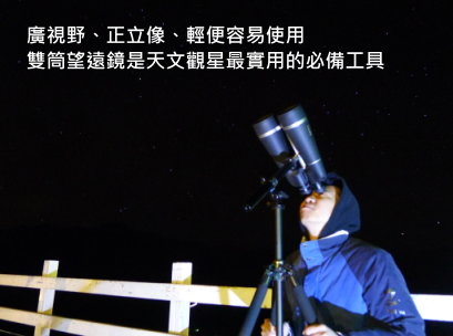 一部雙筒望遠鏡在天文的觀測中是最經濟實用的必備工具,對一個天文同好來說也是最基本的投資了,有人說建立自己裝備的同時,其本身就是一種訓練,會開始蒐集相關資料、詢問專業人士、逛器材店多家廠牌比較等,慢慢的累積許多知識。然而器材只是工具,通常有了自己的器材後,才開始探索浩瀚星空的奧秘。本文作者以十多年專業雙筒望遠鏡測試維修與天文觀測使用經驗撰寫本文,希望能提供給剛入門者或一些有經驗的天文觀測者,最正確的望遠鏡知識以及分享寶貴的使用心得。