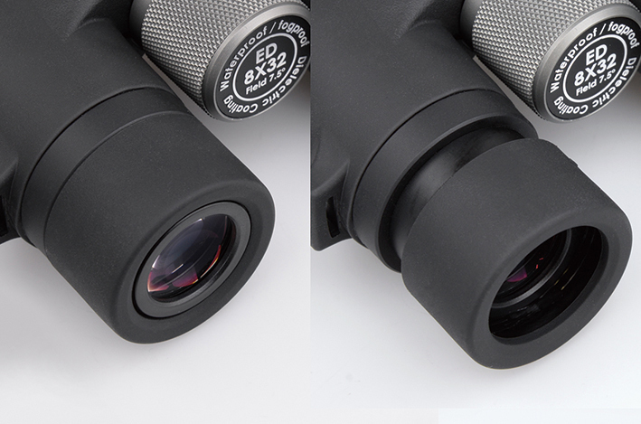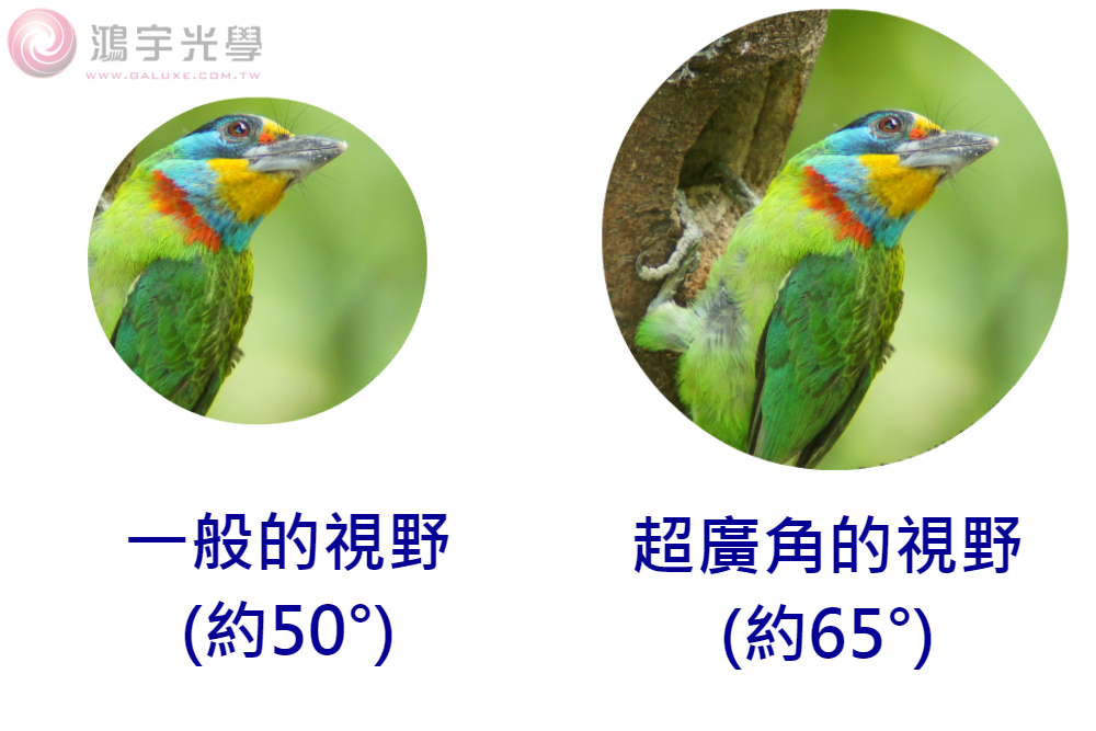 眼視視野越大越好,看起來視野寬敞舒適,價格通常也越貴。雙筒望遠鏡眼視視野達到50~60度就算廣角設計,大部分雙筒望遠鏡都有達到50度,60度以上就達到超廣角 (super wide angle) 標準,像是 Kenko Artos 10X50 就達到66度超廣角設計,如果你覺得某個雙筒望遠鏡視野看起來有窄小的感覺,那就是眼視視野不夠大的緣故。