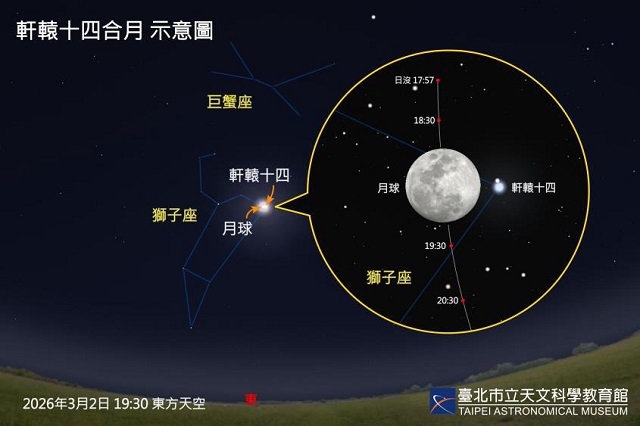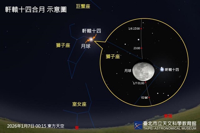 20:41發生軒轅十四合月,軒轅十四亮度1.3等,月齡13.0 位於獅子座,兩星相距0.38°。於17:57日沒後,可見相互近靠的藍白色軒轅十四與月球現於東方天空,於19:30前後最接近。