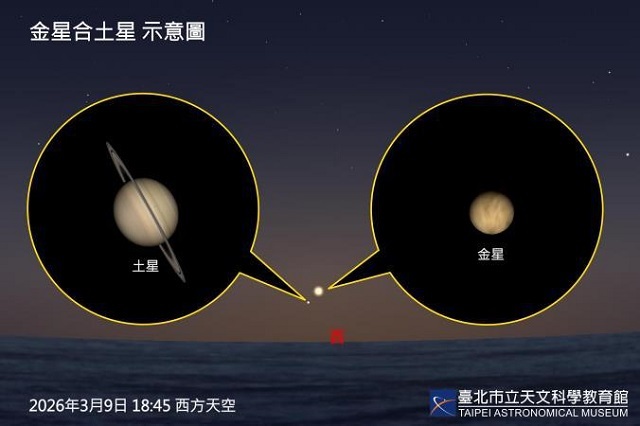 06:11金星合土星,兩星相距僅1.00° 金星亮度-3.9等,土星1.0等,位於雙魚座。前後數日的日沒時,可於暮光中見兩星並列現於西方低空。