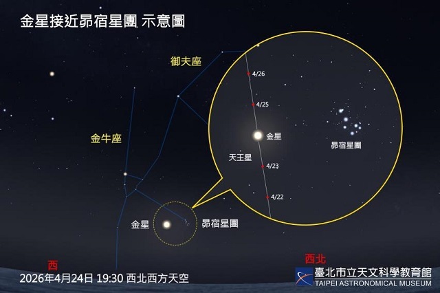 金星於4月23日至25日經過昴宿星團附近,於24日最靠近,此時金星亮度-3.9等,昴宿星團亮度1.6等,暮光漸暗後可見於西北西方天空,可用肉眼或雙筒望遠鏡欣賞金星接近昴宿星團的美景。