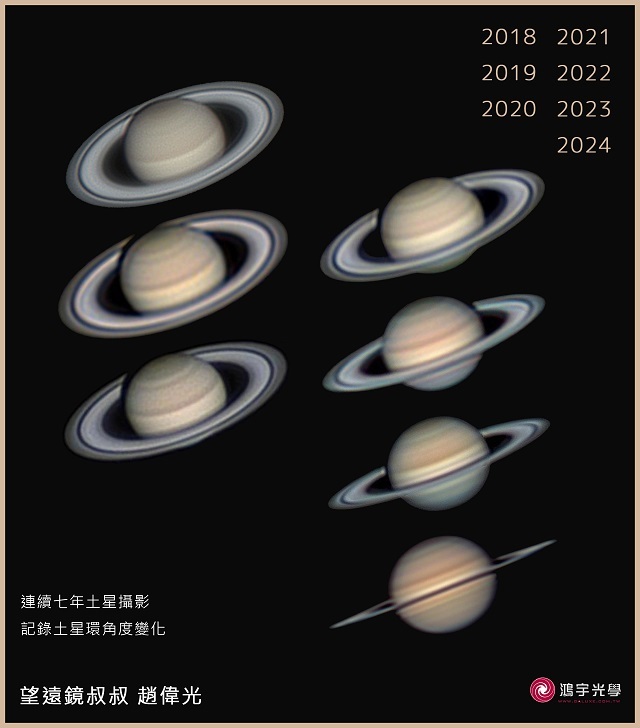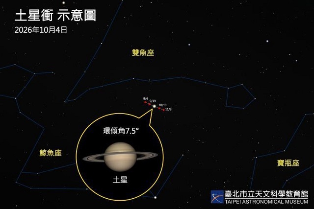 土星衝發生在20:29,亮度0.3等,在雙魚座,視直徑19.7",含光環45.9",還傾角7.5°。土星環傾角在一年間呈波浪狀變化,今年年初時最小,為1.0°並逐漸增加,最大值出現在7月20日的9.2° 之後再度減小至年末的6.4°。