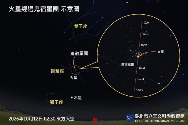 火星於10月11日至13日之間經過鬼宿星團,12日最接近星團中心。此時火星亮度1.1等~1.0等,鬼宿星團亮度3.7等。在12日曙光漸亮前的東方天空,紅色火星在星團中閃耀,與低空的木星相互輝映,建議使用雙筒望遠鏡欣賞。