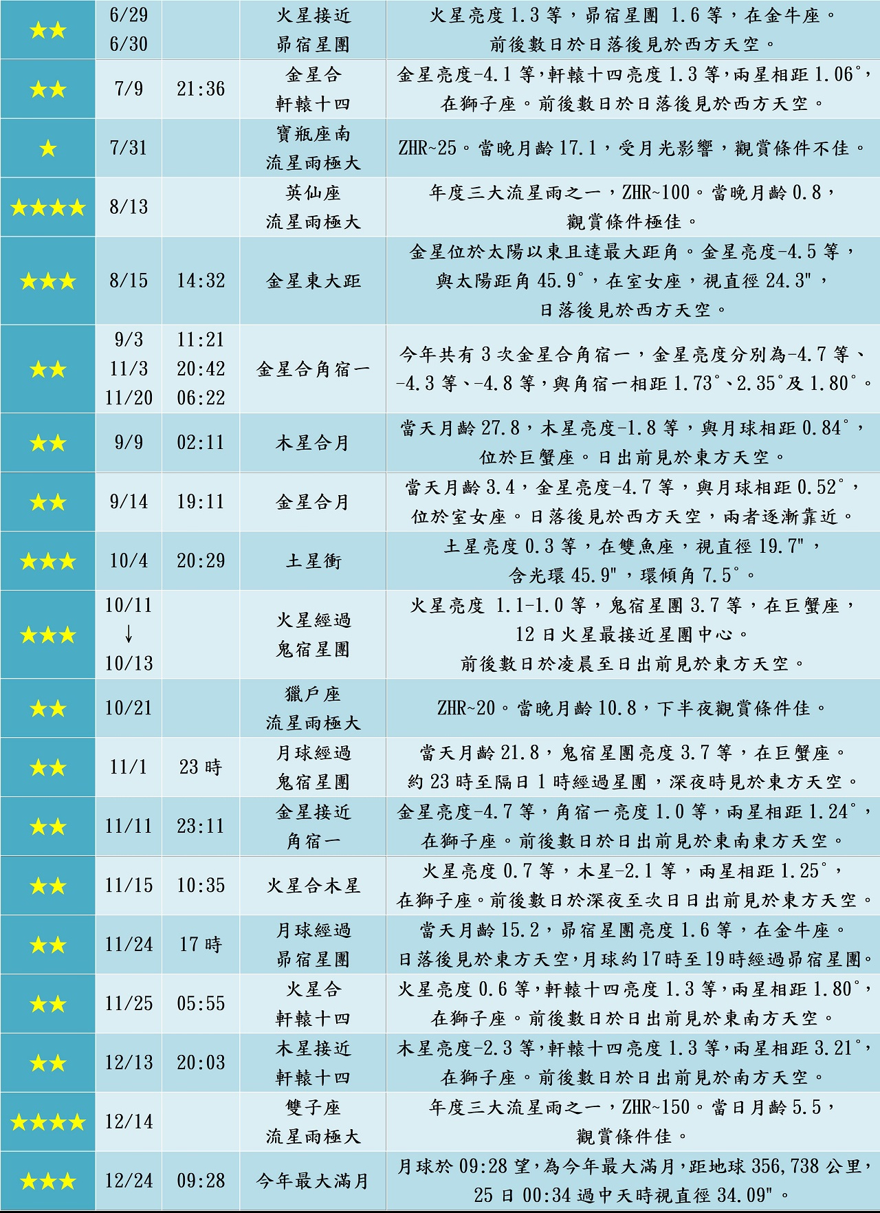 註二:流星雨的表列日期為預測極大期;ZHR 意指輻射點在天頂、且最暗星等達 6.5 等的最佳狀況下,每小時出現率。