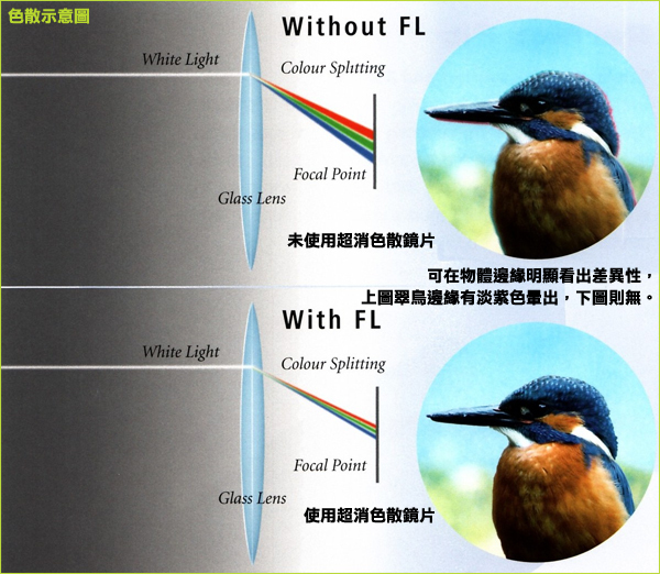 一些兩萬元以下入門款單筒望遠鏡因為成本關係並無採用昂貴的超低色散材質,高倍率強光下物體邊緣會出現紫色或其他顏色光暈,影響影像還原度與銳利度。色散對於鳥類攝影作品的品質會有一些影響,通常各大知名品牌ED或螢石鏡片都要超過三萬元以上,所謂一分錢一分貨,還是要考量到您的荷包預算。