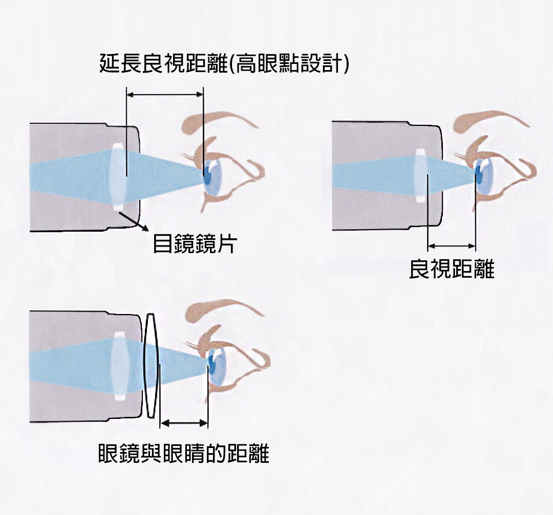 一般使用眼罩來維持目鏡鏡片與眼睛之間良視距離,良視距離長或短是跟目鏡設計有關。如果望遠鏡的良視距離較長(大於15mm),稱為延長良視距離Long eye relief (或稱High eyepoint高眼點設計),適合戴著眼鏡也可以直接拿起雙筒鏡看,大大的增加便利性,加上旋轉伸縮眼罩的機種使用更為方便。
