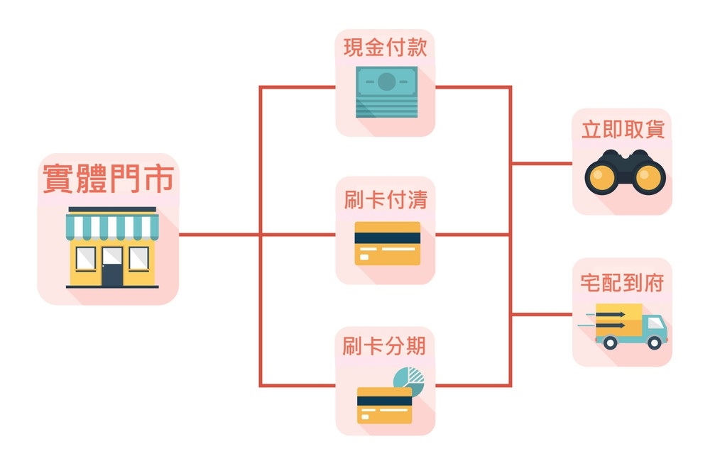 各直營門市現場備有刷卡機,您可以用VISA、MASTER、JCB、銀聯卡等各種信用卡付費。