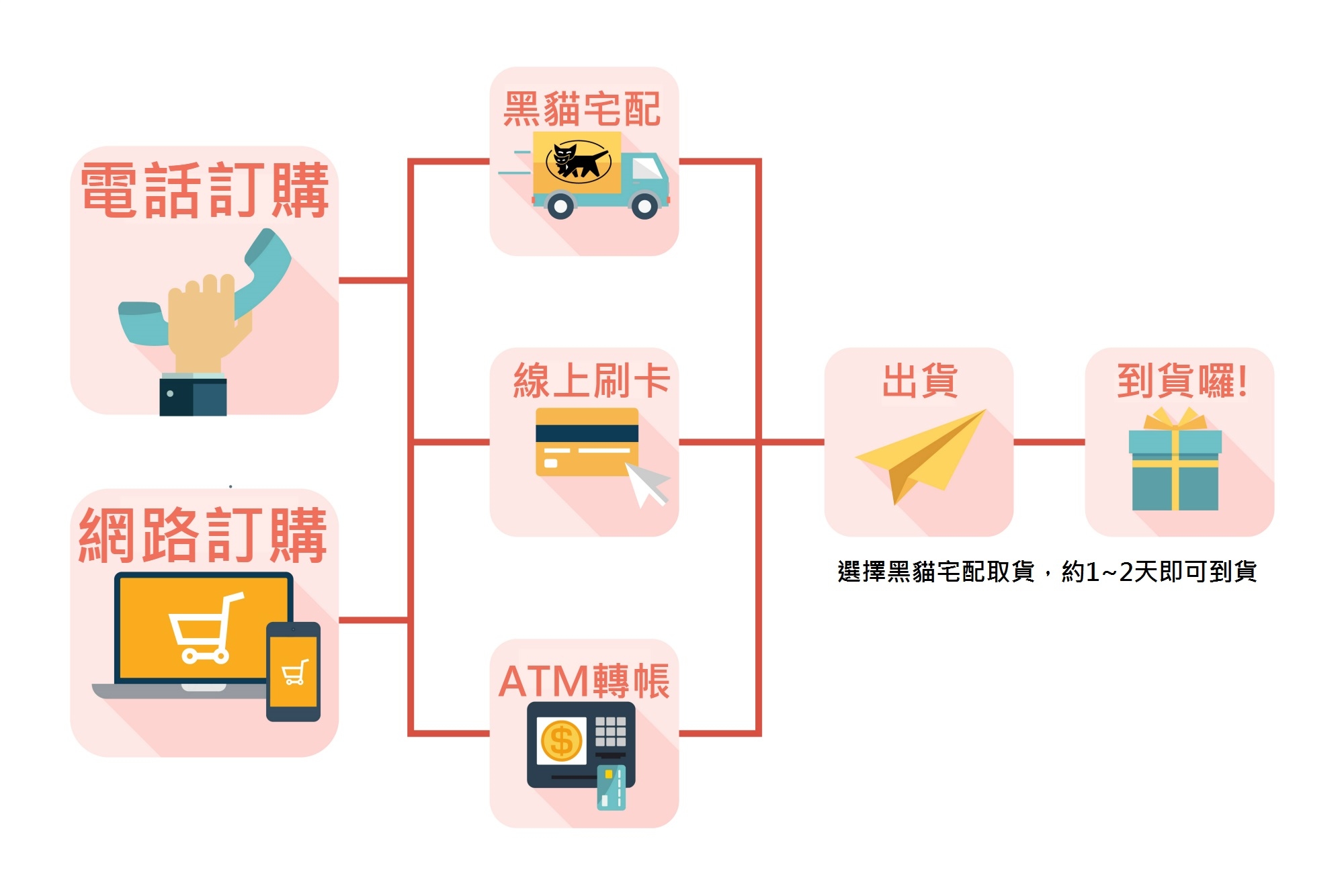 *星期六、日及國定假日不出貨。若於星期六、日訂購,宅配到府服務正常到貨日為星期二或星期三。