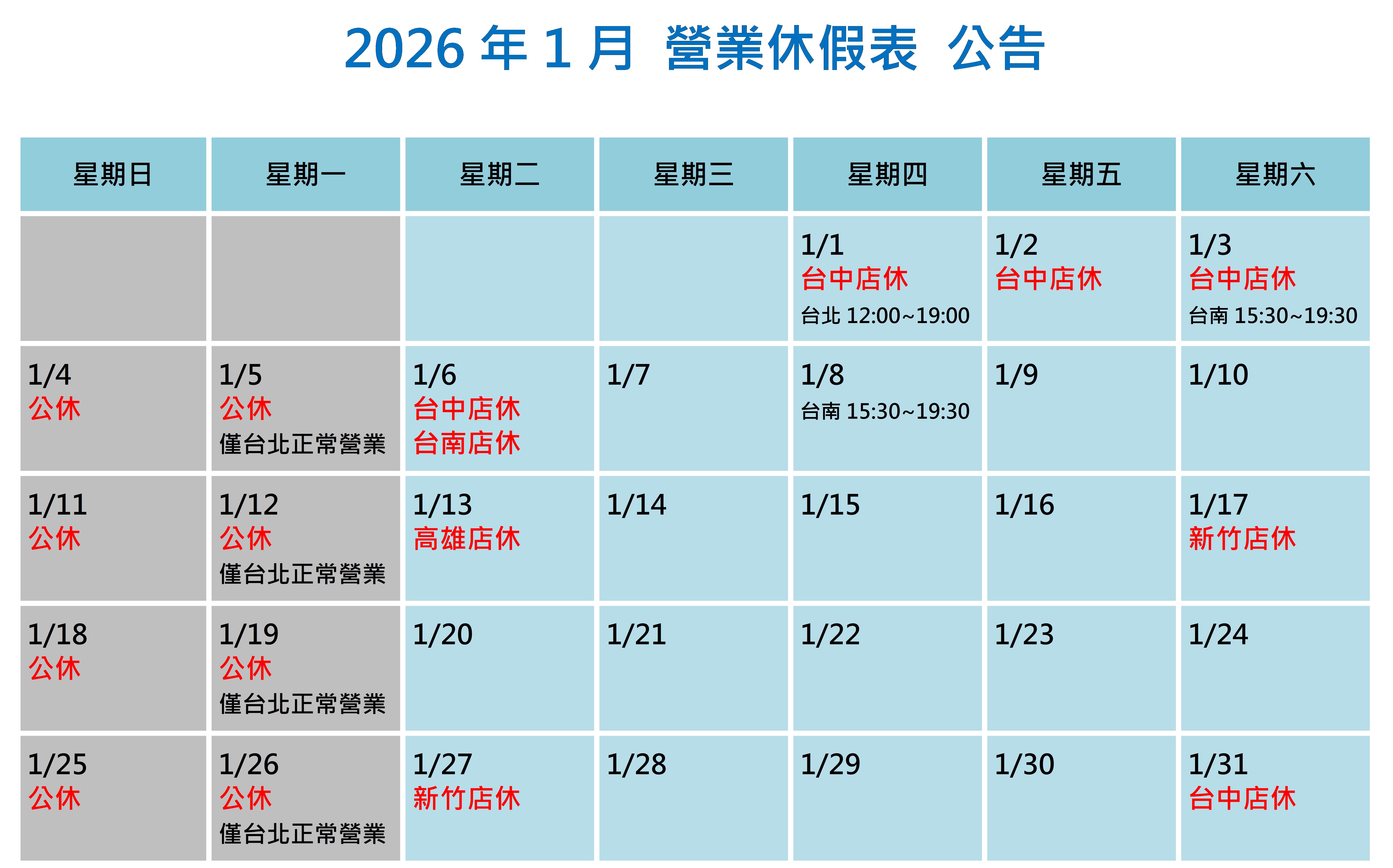 1/22(四)台中門市營業時間調整為12:00~16:30