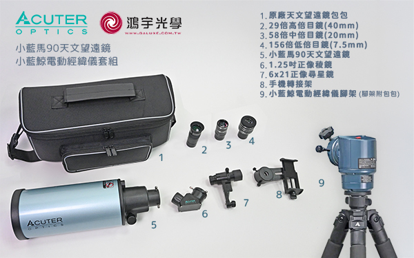 ACUTER小藍馬90天文望遠鏡小藍鯨電動經緯儀套裝內含 20 mm 廣角58.5倍目鏡、29低倍目鏡、156倍高倍目鏡、6×21 導星鏡、相位鍍膜屋脊棱鏡、手機轉接架及鏡筒收納包,無痛進行手機天文攝影。搭配小藍鯨電動經緯儀安全穩定追蹤,也能在白天觀景、拍鳥或記錄旅行點滴。支援星野與日景雙重樂趣。