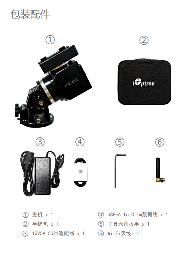 赤道儀本體、變壓器、USB連接線、WIFI天線