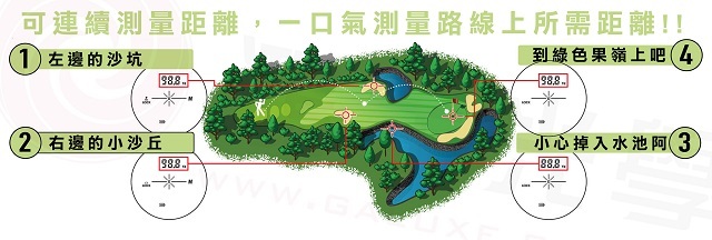 不只顯示直線距離,還能計算出因坡度而需調整的打球距離與角度,有助於提升擊球策略與準確性,能依地形高低自動計算實際參考距離,幫助你在每一次擊球前做出更準確的判斷。