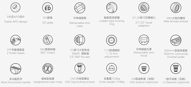 | 鏡片材質 | 三片式全分離APO(包括一片ED玻璃) |