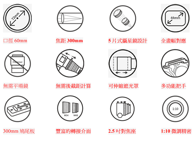 | 鏡片材質 | Quintuplet air-spaced APO (including two ED glass) |