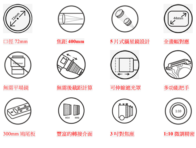 | 鏡片材質 | Quintuplet air-spaced APO (including two ED glass) |