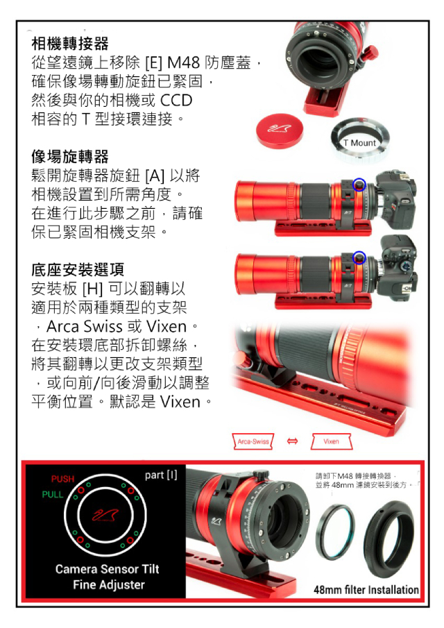 | 鳩尾板型式 | Vixen Type及Arca-Swiss兼容 |
