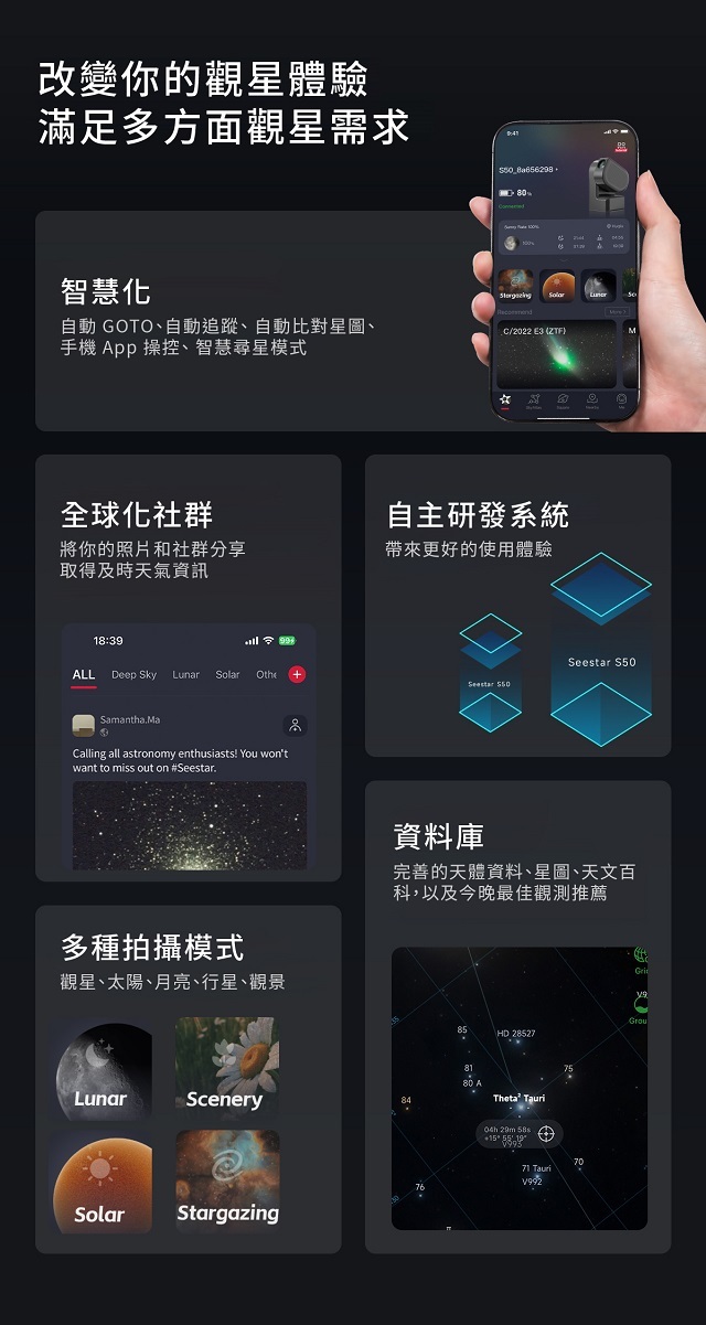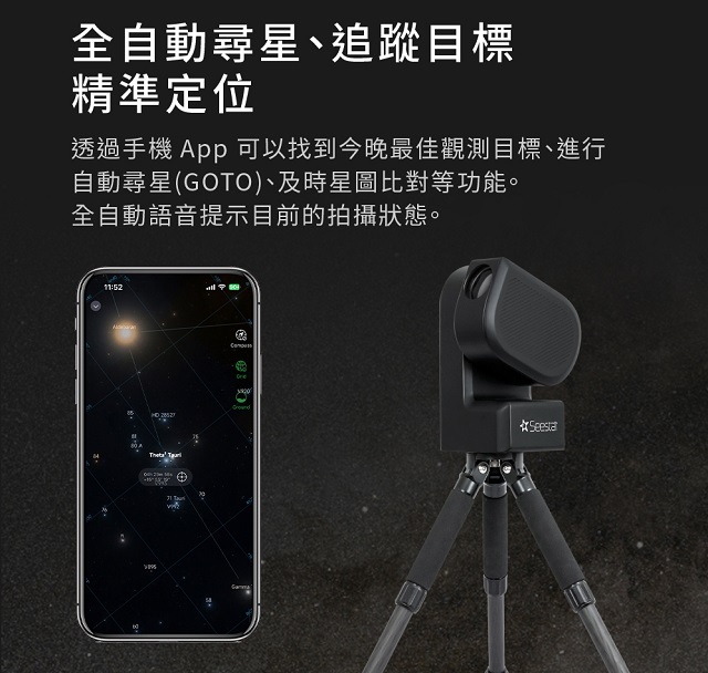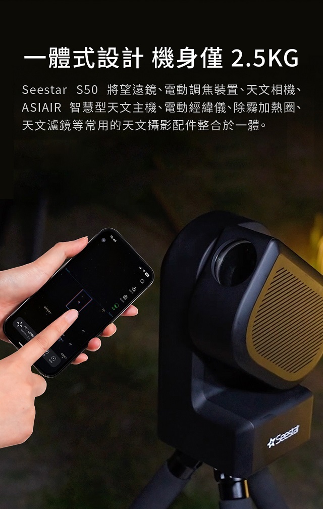 Seestar S50為ZWO首款發表的全自動智慧型望遠鏡,透過智慧型手機或平板電腦的專屬APP,就可以輕鬆實現自動尋星、自動追蹤及自動化即時疊圖。
