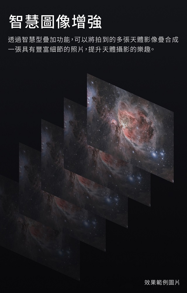 全套設備僅有本體及小型三腳架,組裝相當簡易且迅速,無需任何接線、也無需具備深厚的天文知識基礎,全部的操作皆可在彈指之間完成,開機即可用的黑科技,讓天文攝影成為真正普及化的全民休閒活動。