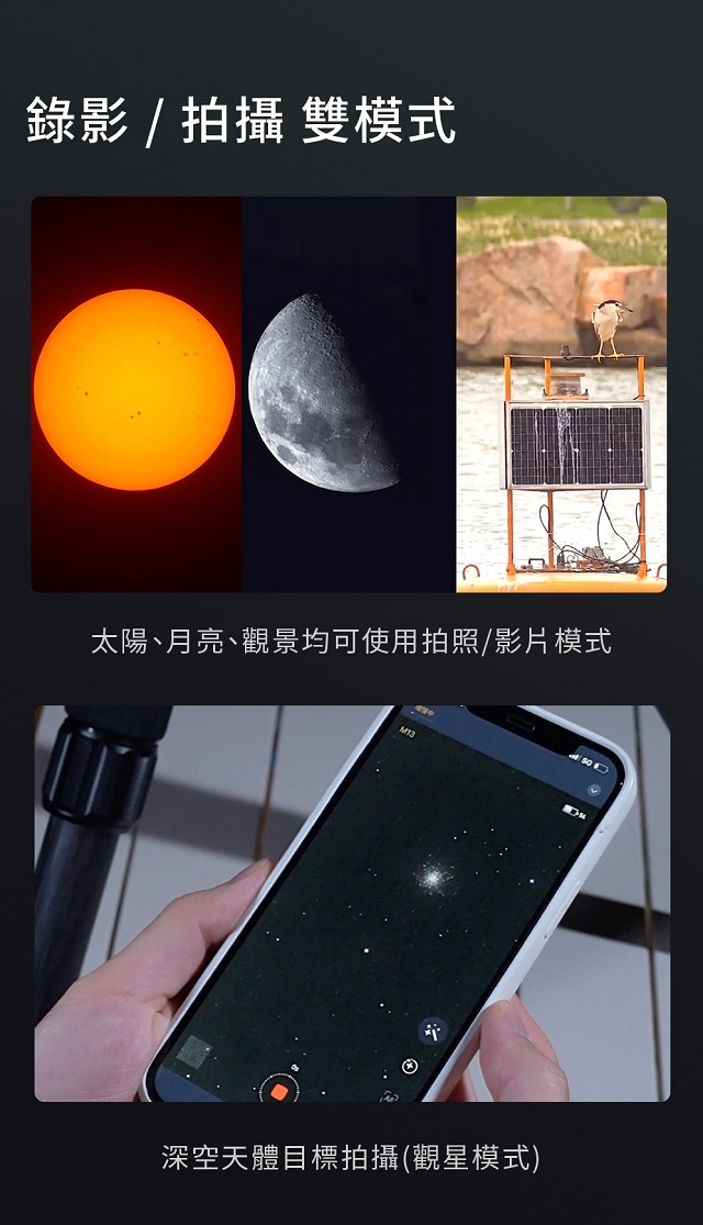 在市區也能輕鬆進行天文觀測,深空天體、行星、月面、太陽都可讓您自在探索;白天也可觀看地景一機多用。