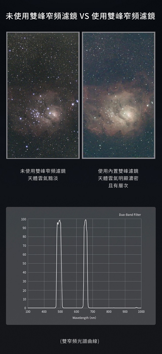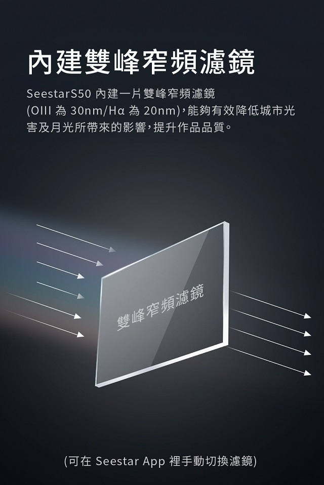Seestar S50內建多種天文濾鏡,透過專屬APP即可輕鬆切換,除了用於消除雜訊的自動型暗場濾鏡,亦內建雙峰窄頻濾鏡,能有效降低都市中心的光害及月光帶來的影響,提升天體影像的拍攝品質。