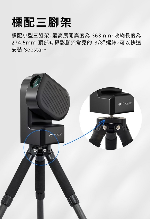 Seestar S50附贈小型三腳架,全展高度為36.3cm,收納長度為27.5cm,頂端配置3/8”螺絲,可直接安裝於Seestar S50底座