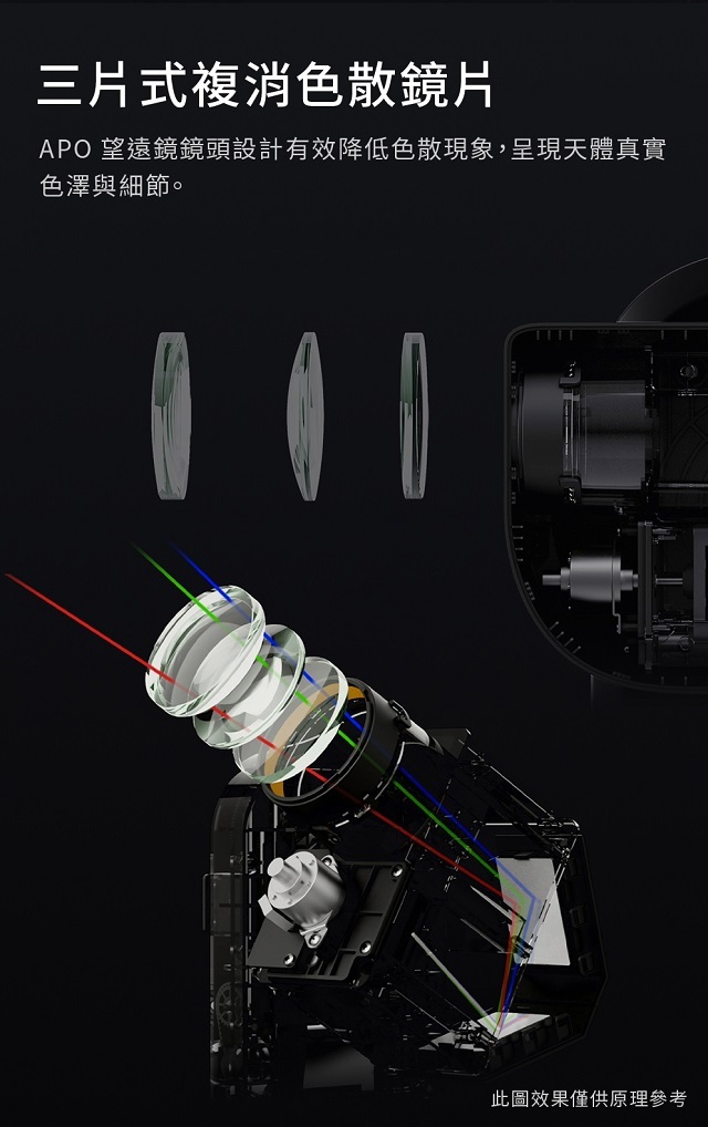 Seestar S50採用三片式複消色散鏡片,因此有效降低了光線穿透鏡片時產生的色散現象,更能真實呈現天體的色澤與細節。